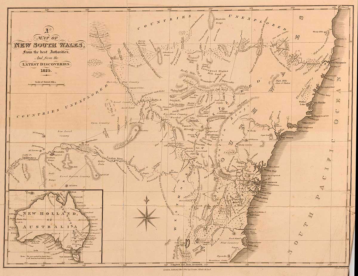 Map showing areas known to British colonists in the colony of New South Wales. The map also indicates areas that had not yet been explored.