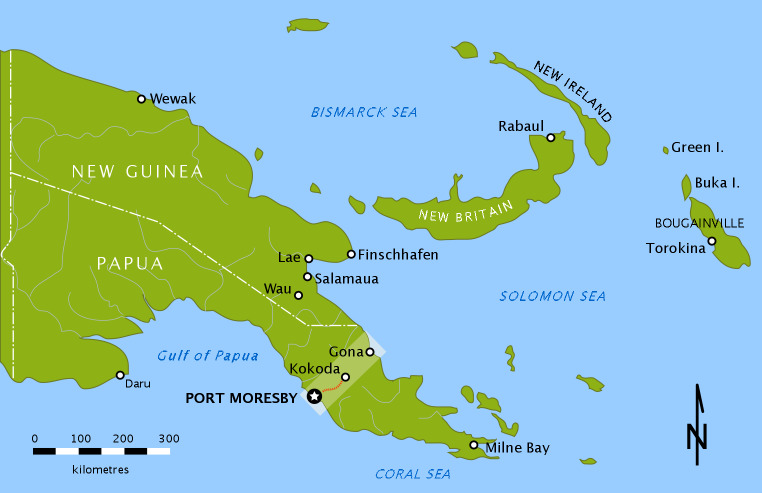 The map shows the two territories, and highlights the area of Papua where the Kokoda Trail battle took place during the Second World War.