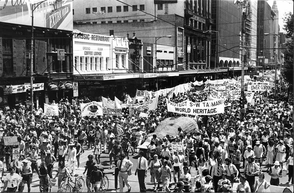 Protestors at the corner of Swanston Street and Flinders Street, 13 November 1982. In 1982 and 1983 protesters and environmental activists led a campaign to stop the damming of the Franklin River in Tasmania. This action saved a key wilderness area and raised awareness of environmental issues. The political success of the environmental groups involved eventually led to the formation of the Greens, now Australia’s third most popular political party.
