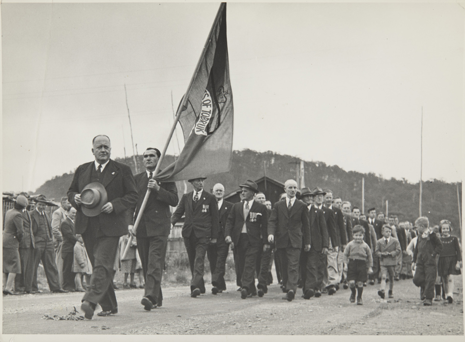 A man is in the foreground holding a hat, with a second man carrying a flag. Children are running alongside. ‘25.4.49’ is in blue pen on the back with a further three lines of writing.
