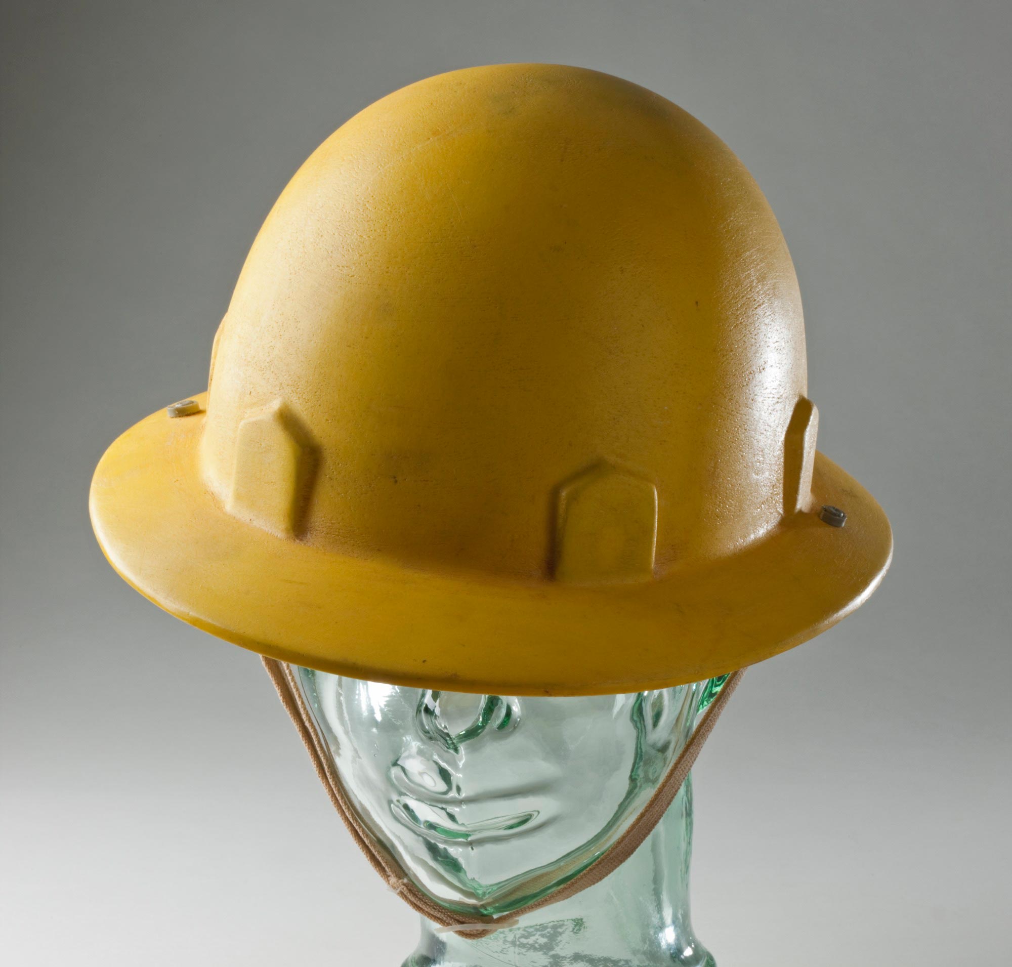 Moulded yellow plastic hard hat used by a worker on the Snowy Mountains Hydro-Electric Scheme
