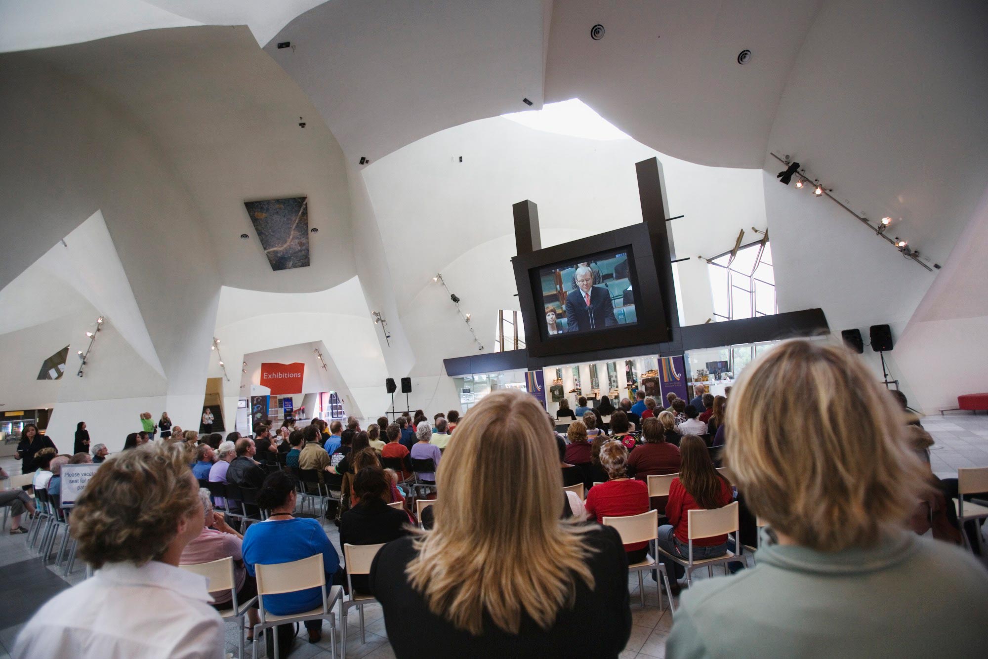 In this photograph, visitors and staff watch the Rudd’s apology in the National Museum's main hall.