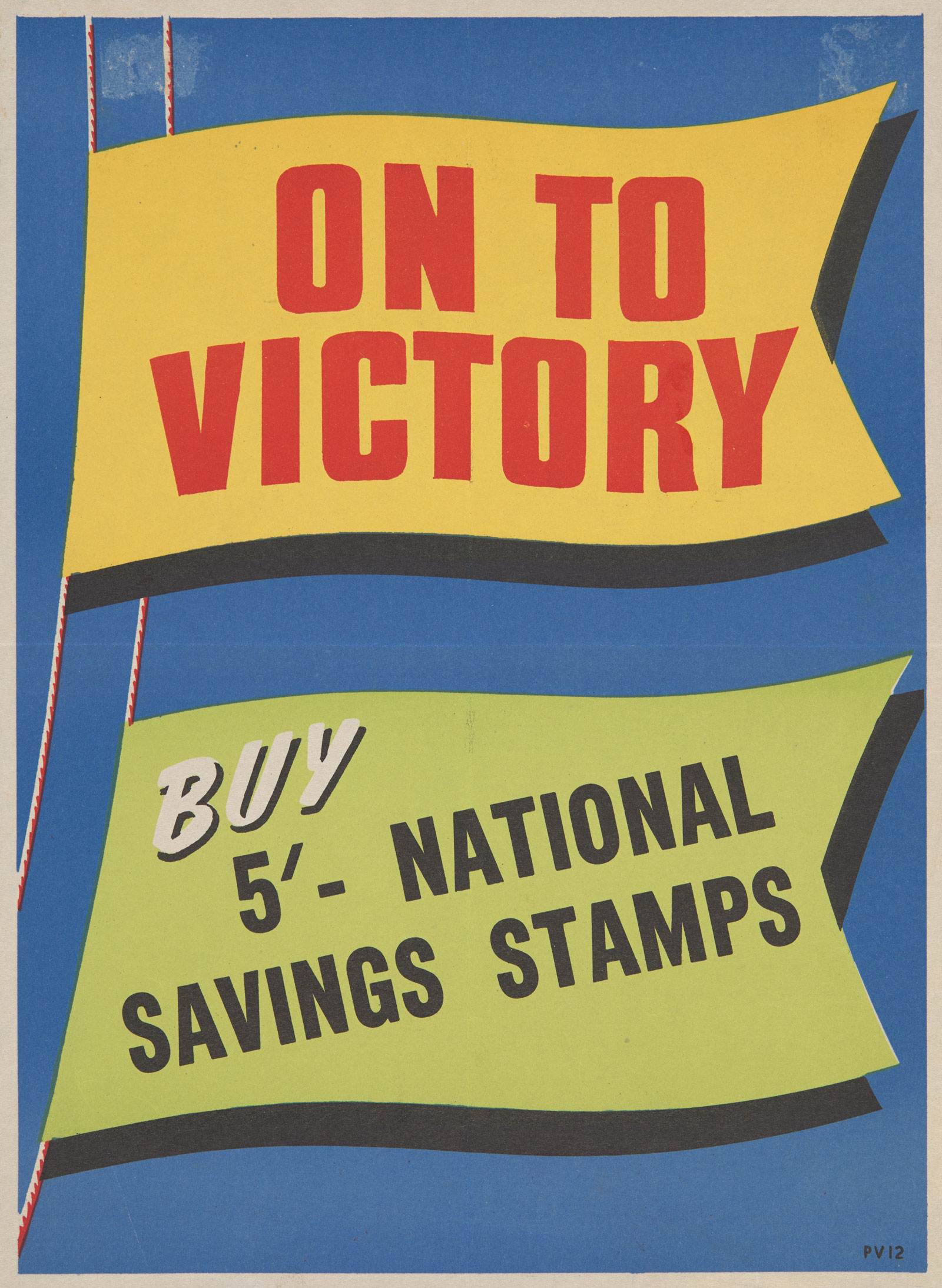 Poster produced during the Second World War to encourage Australians to buy war savings stamps at five shillings each to help fund the war effort. Stamps were stuck into a special booklet that could be redeemed for a bond or certificate.