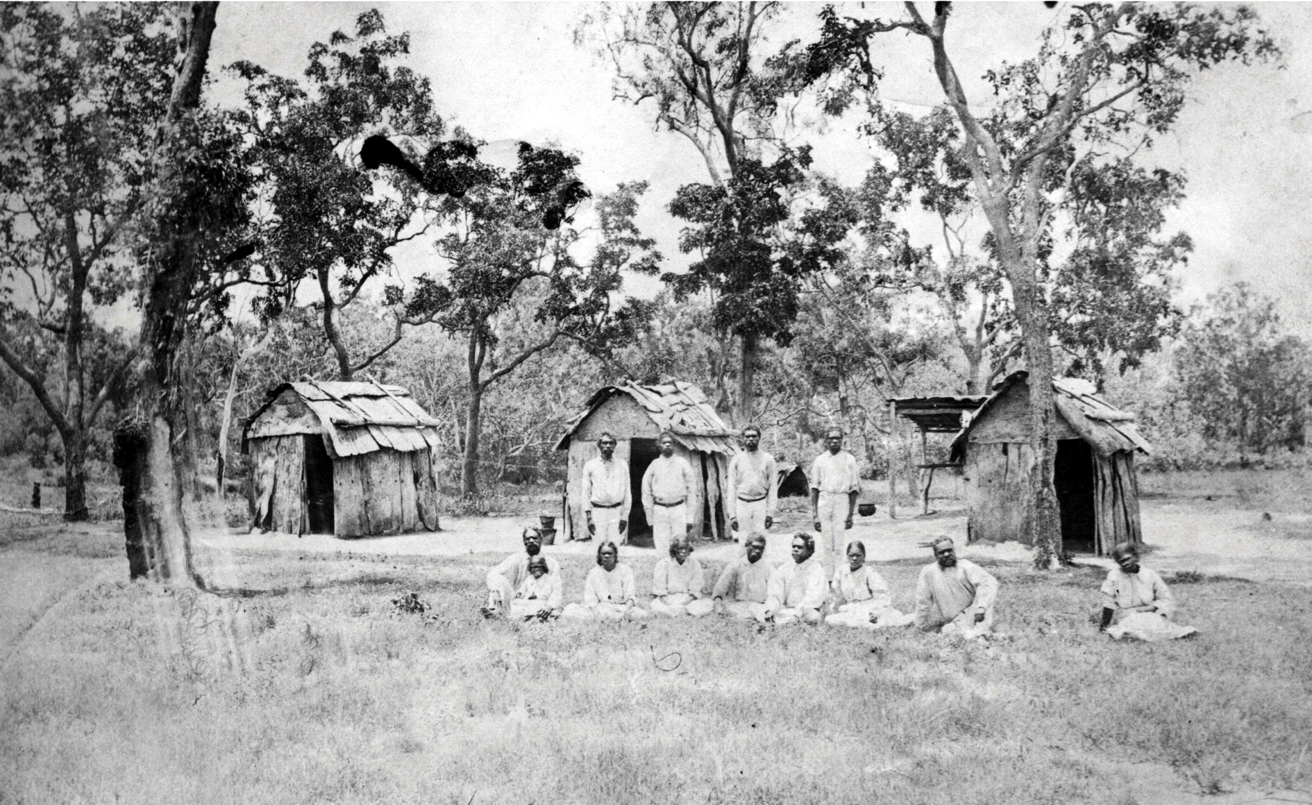 Native Police troopers and their wives outside their bark huts at the Laura River Native Police camp in 1881.