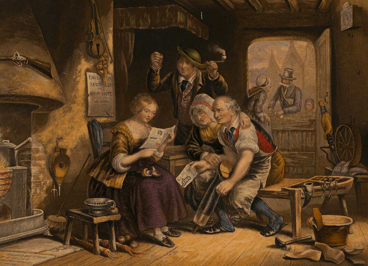 A family in Great Britain eagerly read a letter from friends or family who have emigrated to Australia. In the background is a poster advertising emigration to Australia aboard the ship Hope.