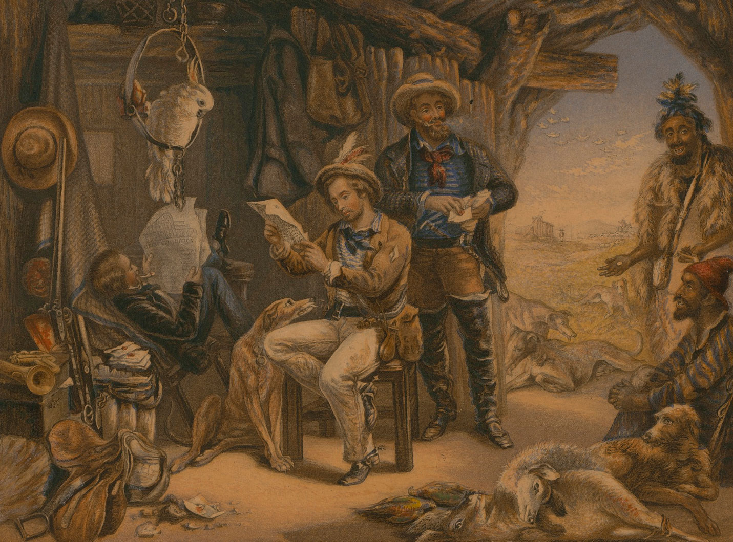 From 1831 the British and Australian colonial governments paid for part or all of the cost for some migrants to travel to Australia. This was known as assisted migration. The two men in the centre of this painting might represent assisted migrants, reading news from Great Britain.