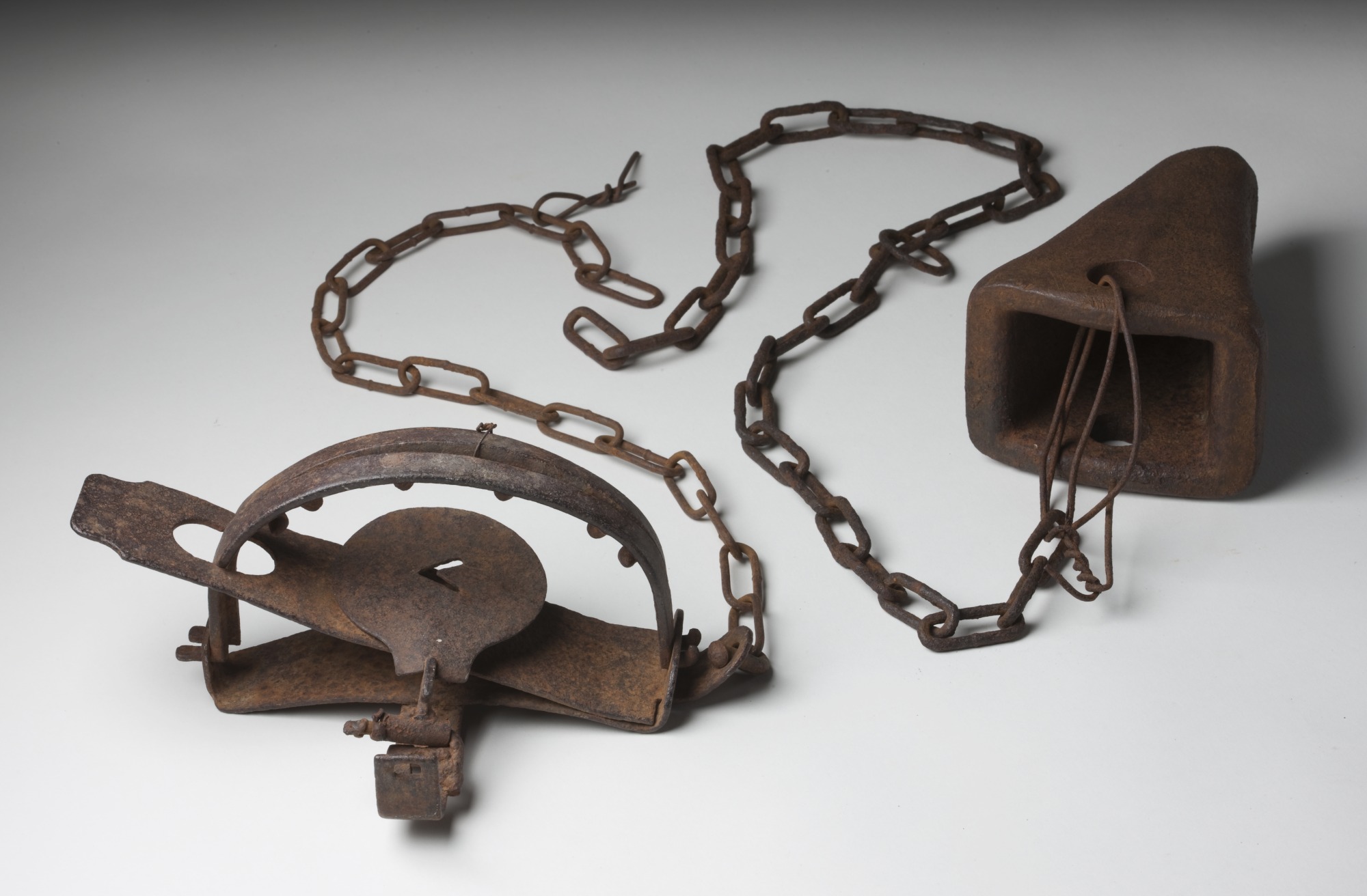 This trap has arched metal jaws and a circular metal plate on top of the trigger. A length of chain with oblong links is attached.