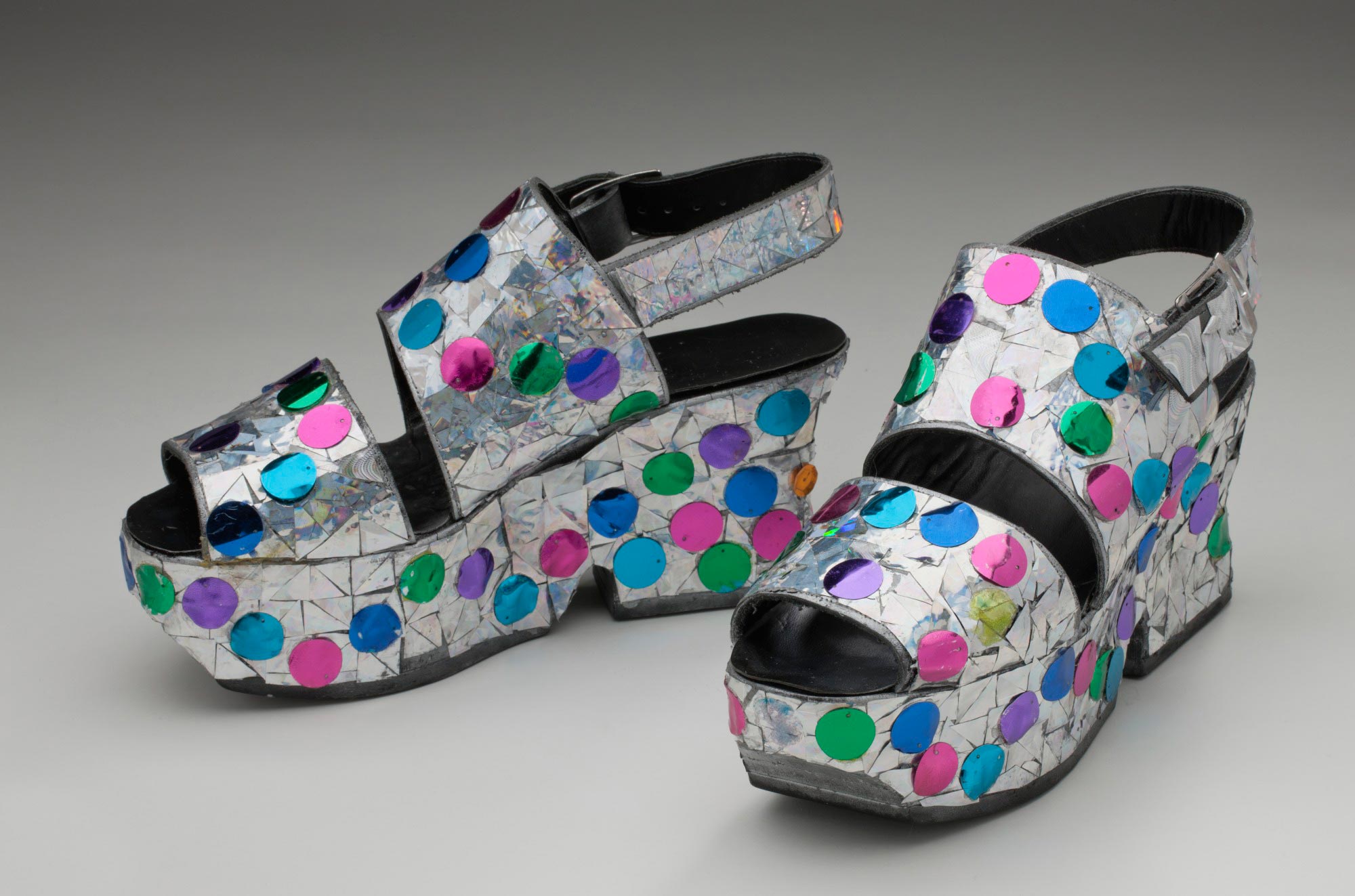 These shoes form part of Ron Muncaster's prizewinning 'Lucille Balls' costume worn at the 1994 Sydney Gay and Lesbian Mardi Gras. Muncaster is a well-known costume designer and remains one of the most successful within the context of Mardi Gras. He has made a significant contribution to the Mardi Gras event by participating every year in the costume competition. Muncaster has been awarded more prizes for his costumes than any other designer in the history of the competition.