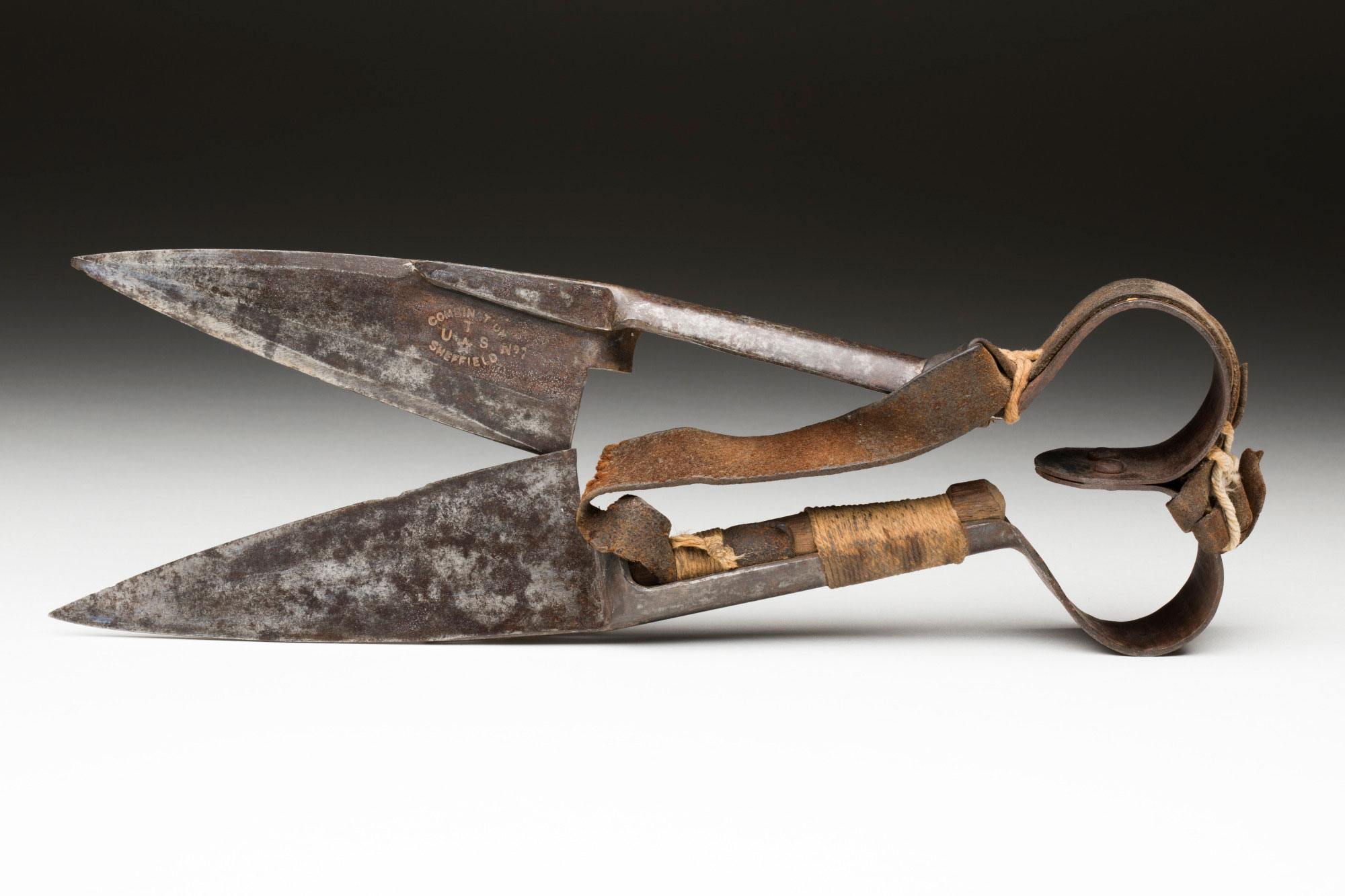 A pair of hand shears used for crutching sheep at Rocky Plains sheep station, near Berridale, New South Wales. The shears are made of wrought iron, with pointed blades. The shears have carved wooden hand grip fitted and spliced inside the shaft of one blade, and a leather strap attached.