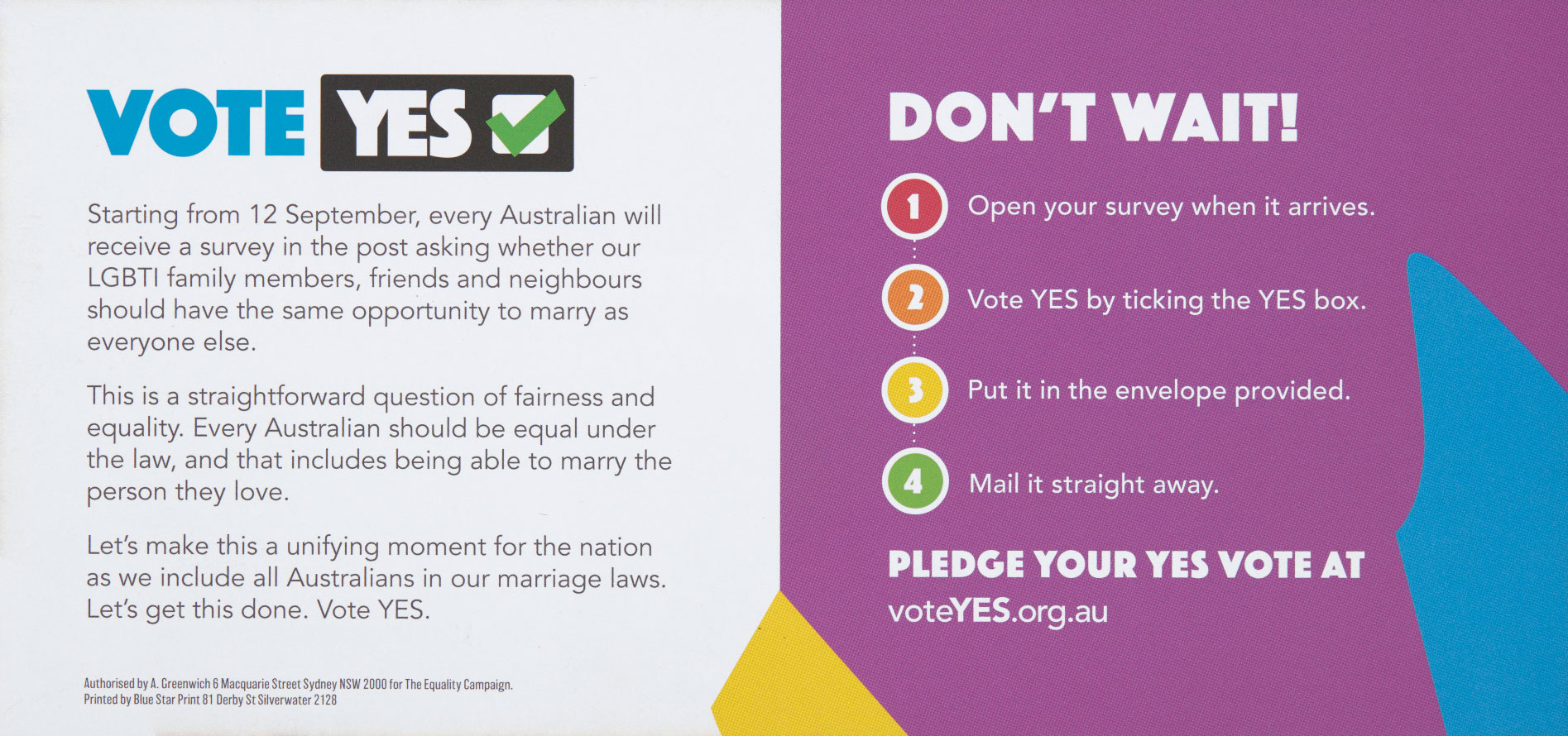 Equality Campaign material distributed in the lead up to the Australian Marriage Law Postal Survey. They survey took place between September and November 2017. It determined public opinion regarding whether the Marriage Act should be amended to make same-sex marriage legal. It was highly controversial and vigorous campaigning took place on both the ‘Yes’ and ‘No’ sides. On 15 November 2017 the Australian Bureau of Statistics announced the survey’s results: 61.6 per cent of participants had voted ‘yes’. Three weeks later the House of Representatives amended the Marriage Act, redefining marriage as ‘a union of two people’.