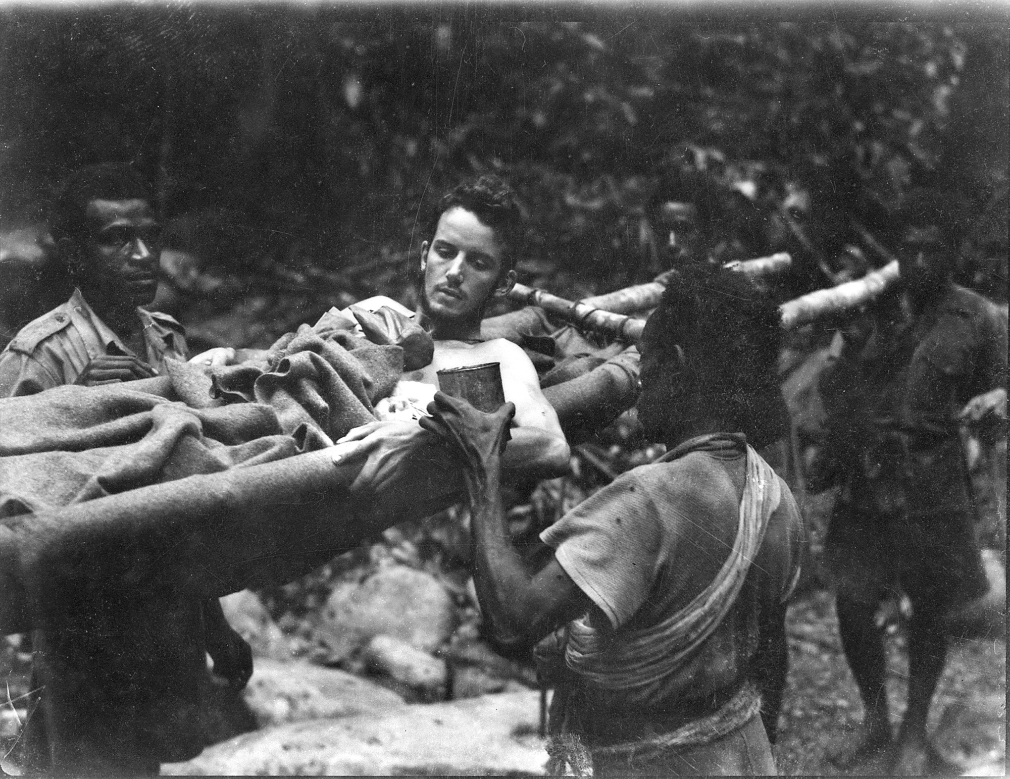 Papuan stretcher bearers help an injured Australian soldier on the Kokoda Trail, 1942
