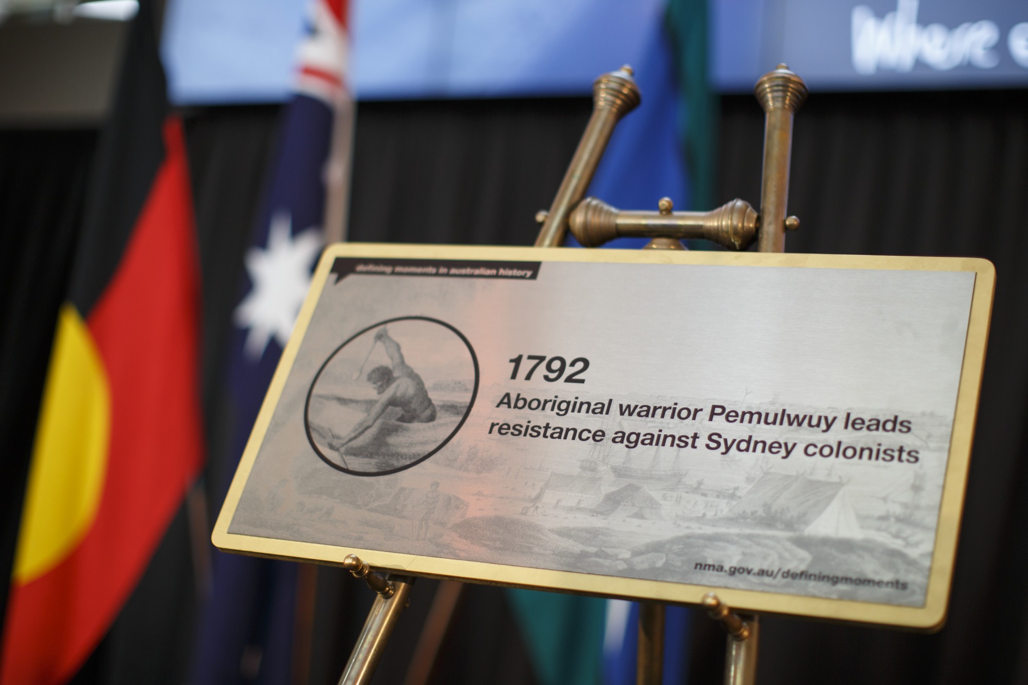 Bidjigal resistance leader Pemulwuy’s plaque at the National Museum of Australia. The plaque is now located in the floor of the National Museum of Australia’s Gandel Atrium.