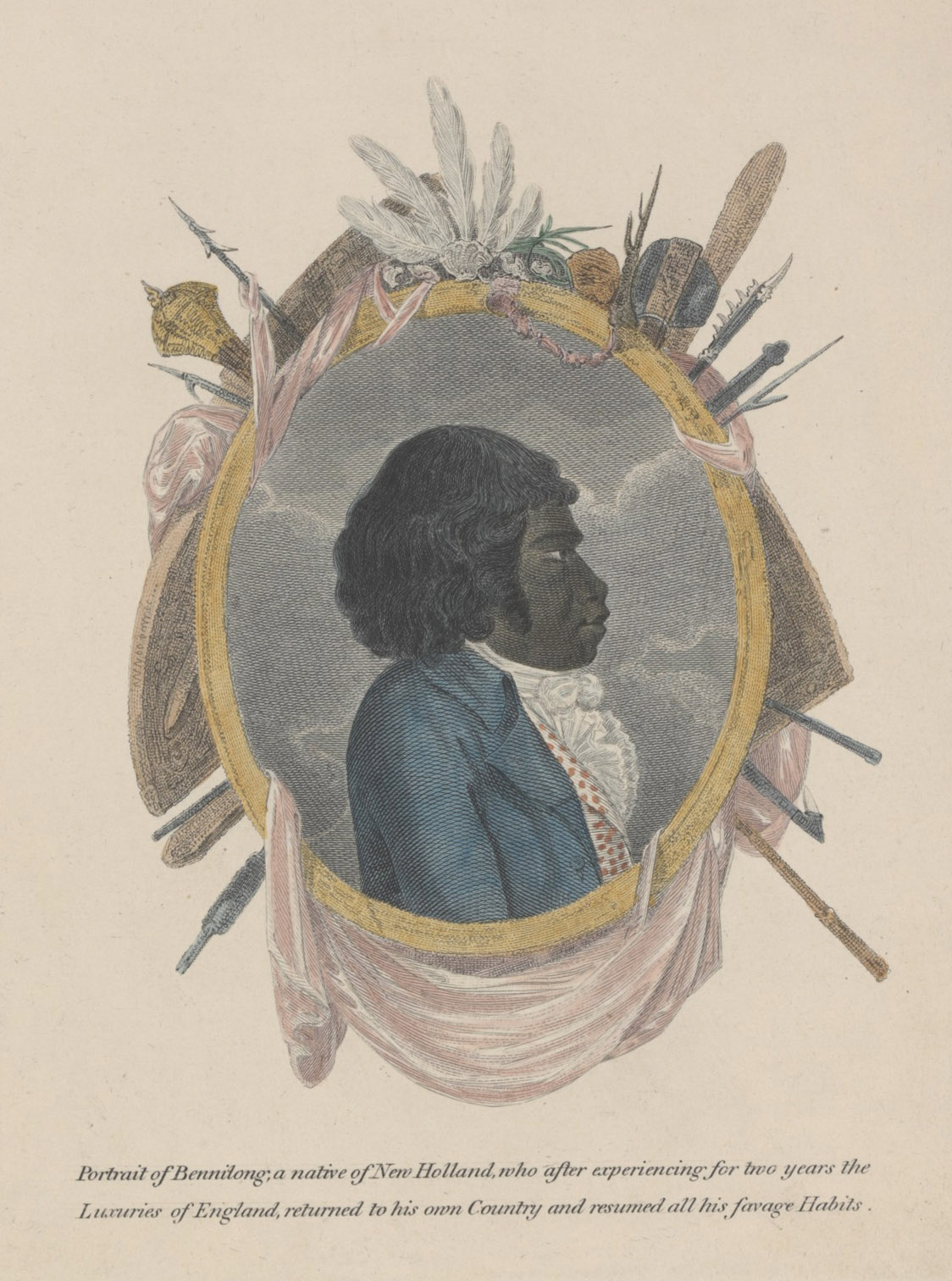 ‘Portrait of Bennilong’ by Samuel Neele (artist and engraver) from G. A. Cooke, Modern and Authentic System of Universal Geography, 1802. Bennelong was an Eora man who learned to speak English and travelled to England with Governor Arthur Phillip in 1792.