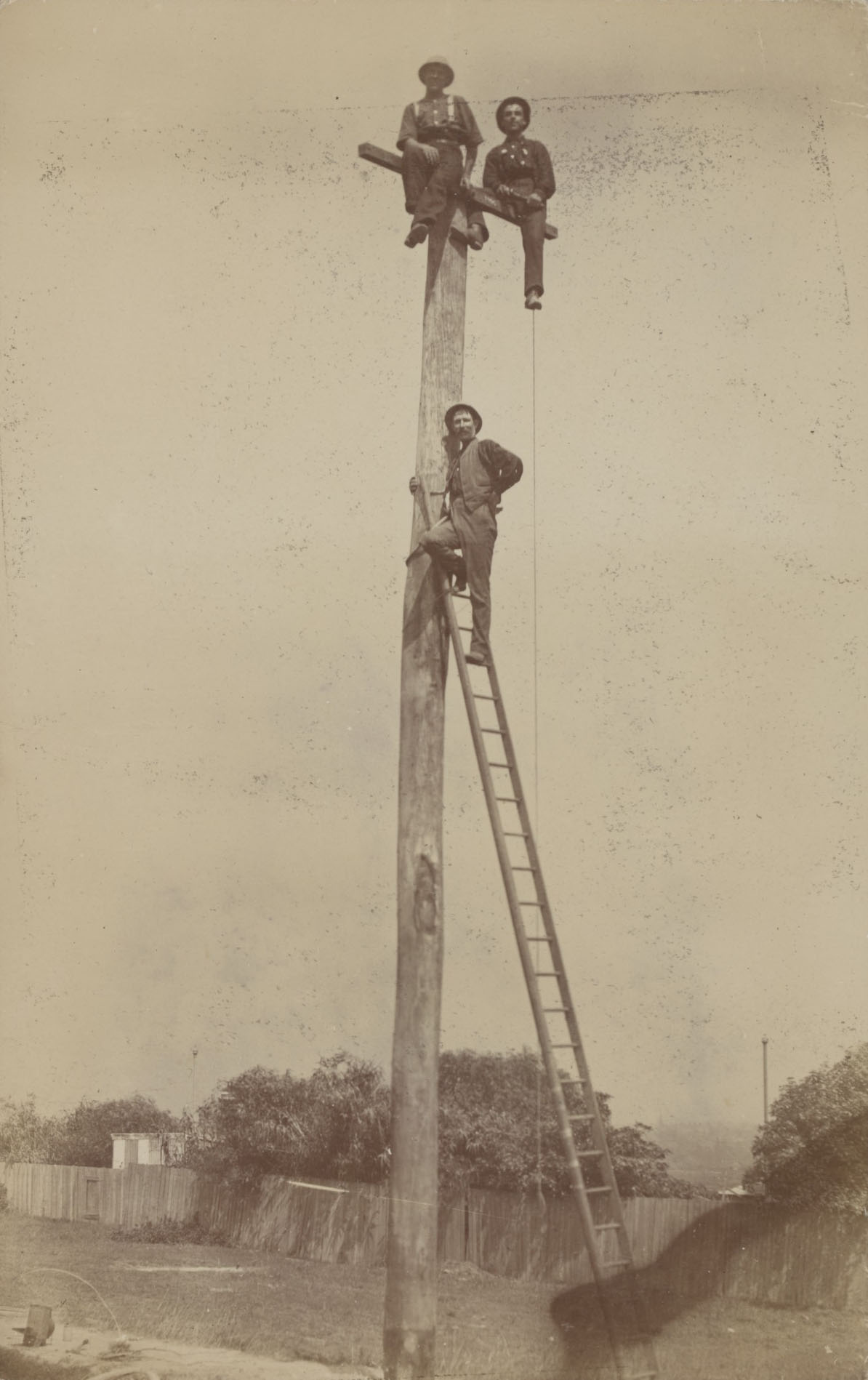 Postcard featuring a photograph of a telegraph pole with three men on it