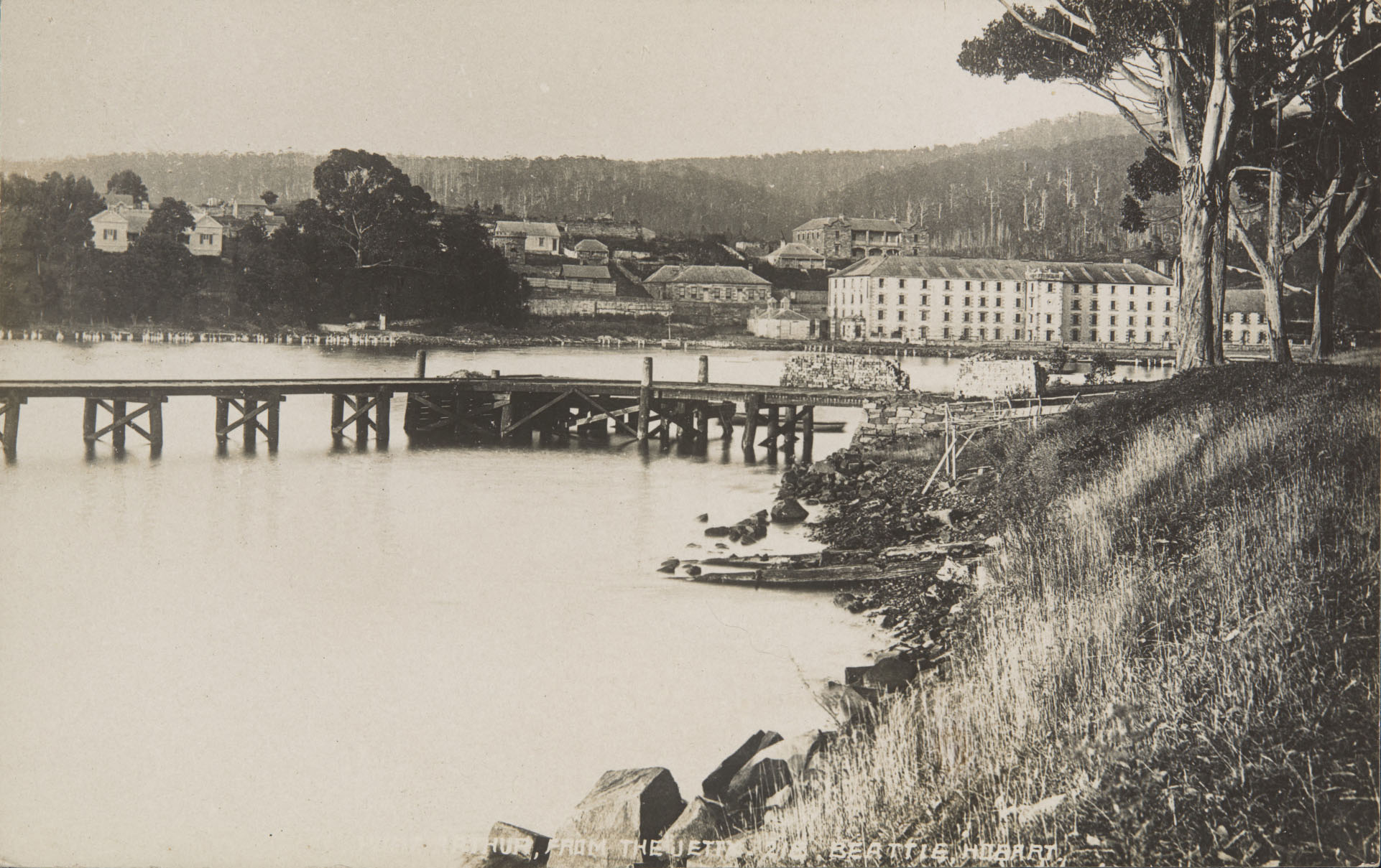 A postcard featuring a black and white photograph of a view across a body of water with a jetty in the foreground and buildings, trees and mountains in the background. Handwritten text on the front of the postcard describes the photograph as ‘Port Arthur, from the jetty’ and also ‘Beattie, Hobart.’The postcard is unused.