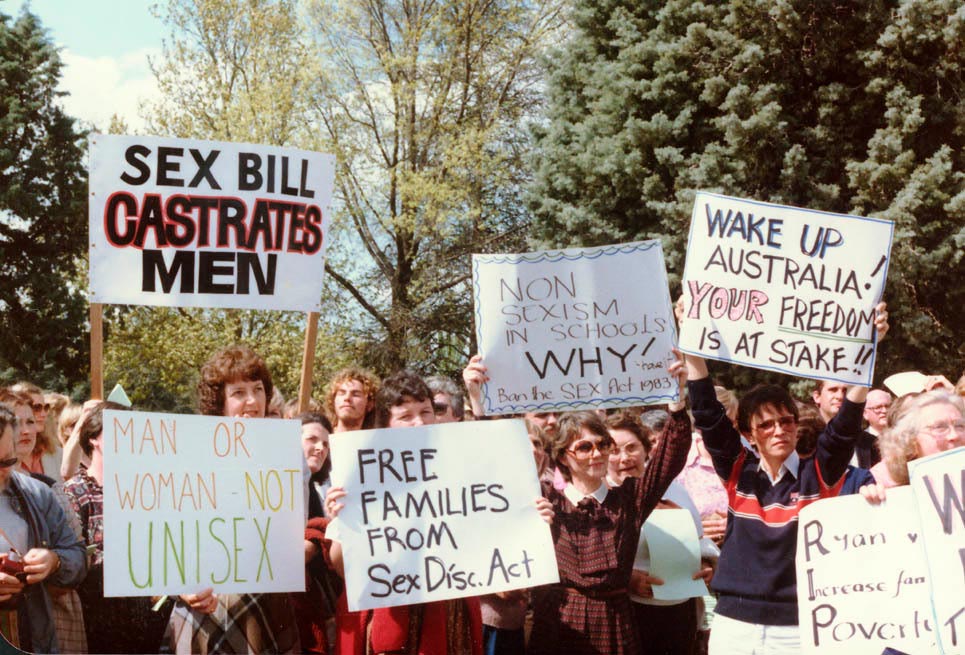 Some members of the Australian community protested the Sex Discrimination Bill, introduced into the Senate in June 1983. The bill was eventually passed and became the Sex Discrimination Act 1984.