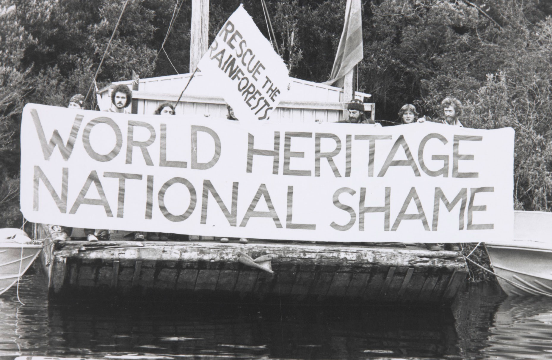 A black and white photograph of seven protesters standing on a jetty holding a large banner that reads ‘WORLD HERITAGE / NATIONAL SHAME’. A smaller flag is being waved by one protester that reads ‘RESCUE THE RAINFORESTS’.
