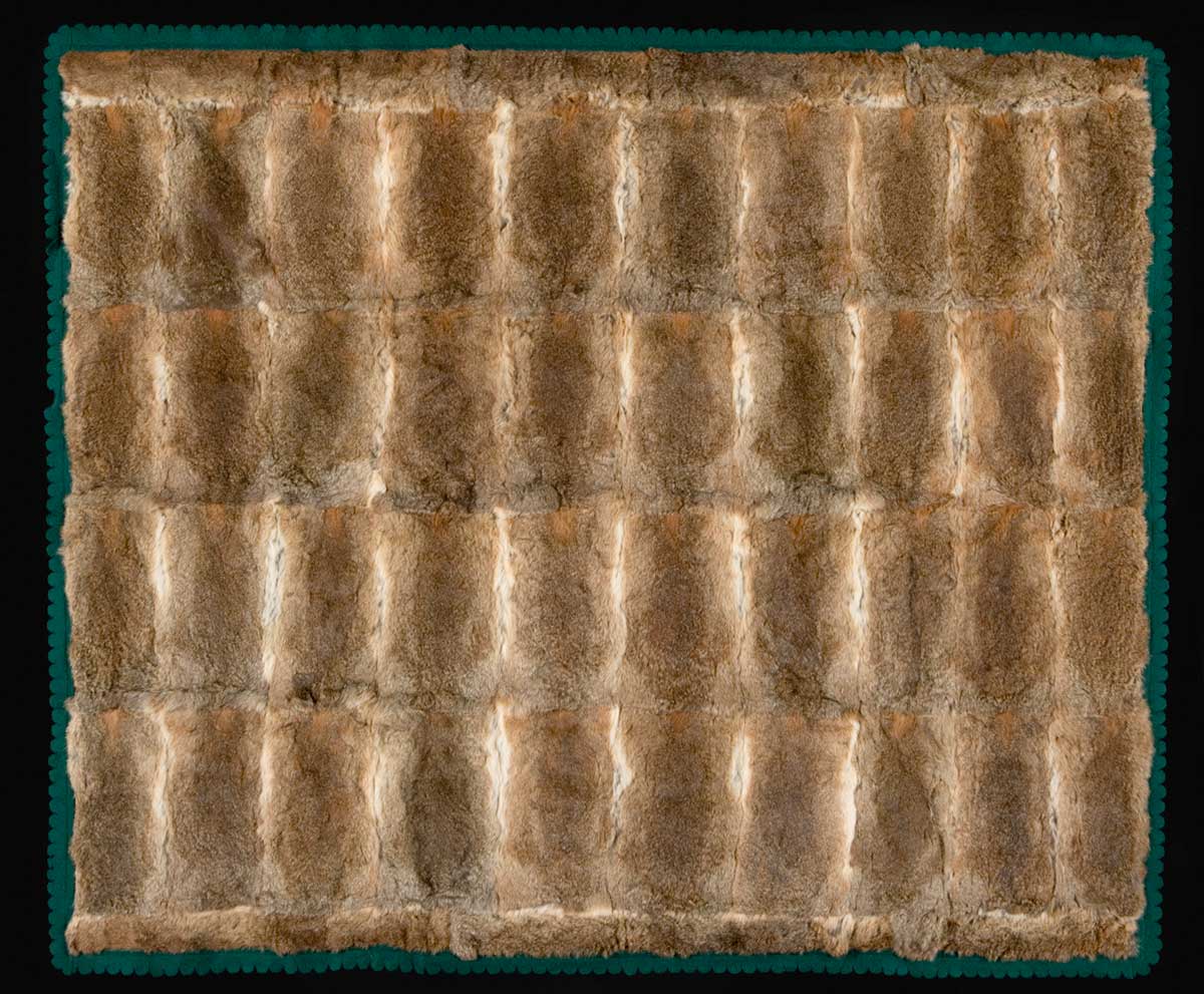 An acquaintance of the Smith family provided the rabbit skins for the rug. The pelts are well-matched in colour and texture as the rabbits were all reportedly trapped from the same burrow. Thelma had the skins tanned by Wagga Wagga furrier, Schultz Tannery, where much of the work preparing and tanning skins continued to be done by hand. The pelts were carefully pieced together to ensure the fur ran in the same direction.