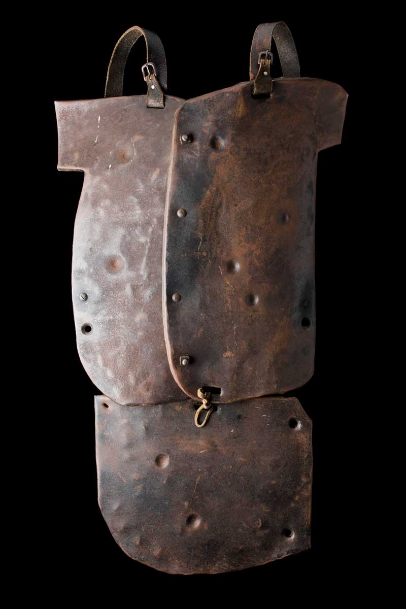 Three piece set of armour made from moulded sheet steel lined with fibreglass. Composed of breastplate, groin plate and back plate with leather straps. It has a rusty weathered steel finish.