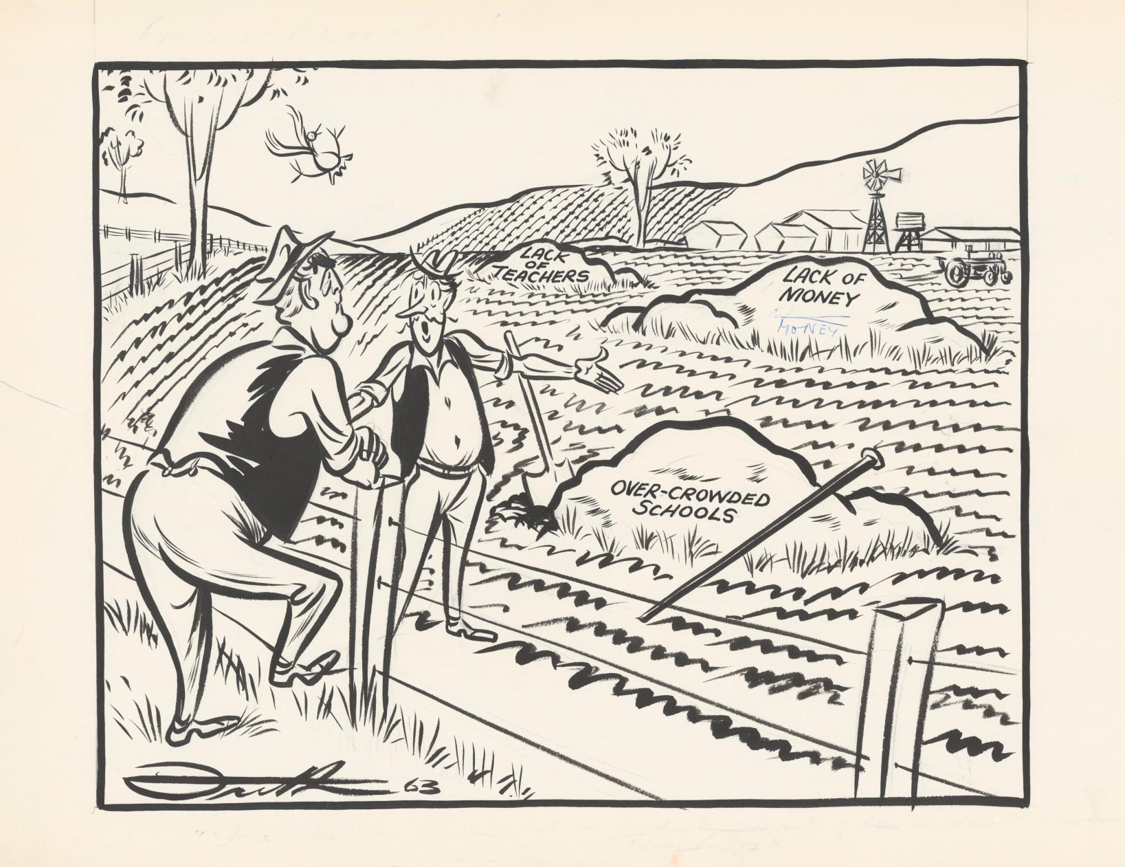 One farmer complains to other farmer (Prime Minister Robert Menzies), gesturing at mounds amongst furrows on his land. The mounds are labelled: ‘Over-crowded school’, ‘Lack of teachers’ and ‘Lack of money’.