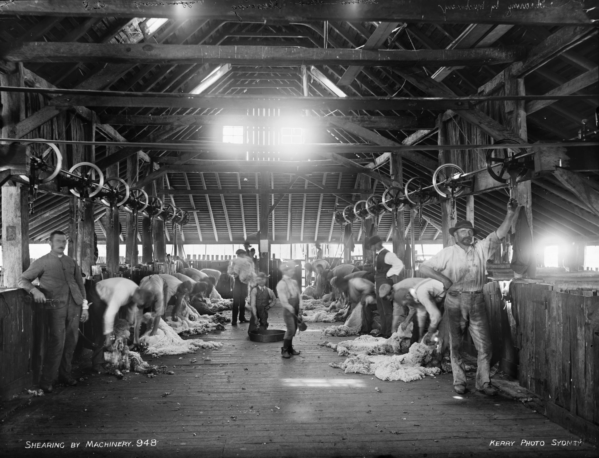 Shearers using mechanised shearing equipment in a large shearing shed. Photograph taken between 1890 and 1917.