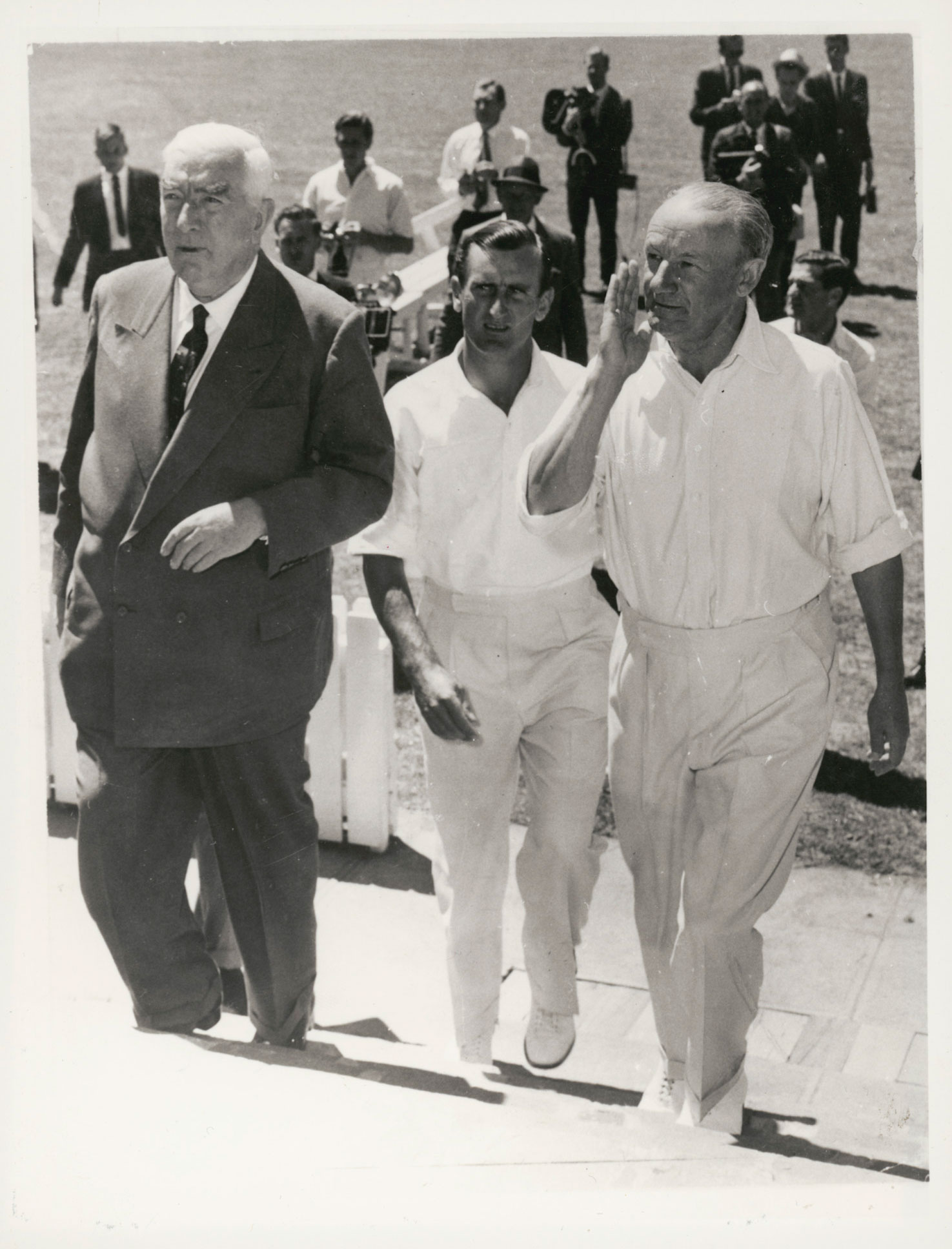 Menzies, Dexter and Bradman at Manuka Oval for the playing of the Prime Ministers XI cricket match and the opening of the Bradman Pavilion, February 1963.