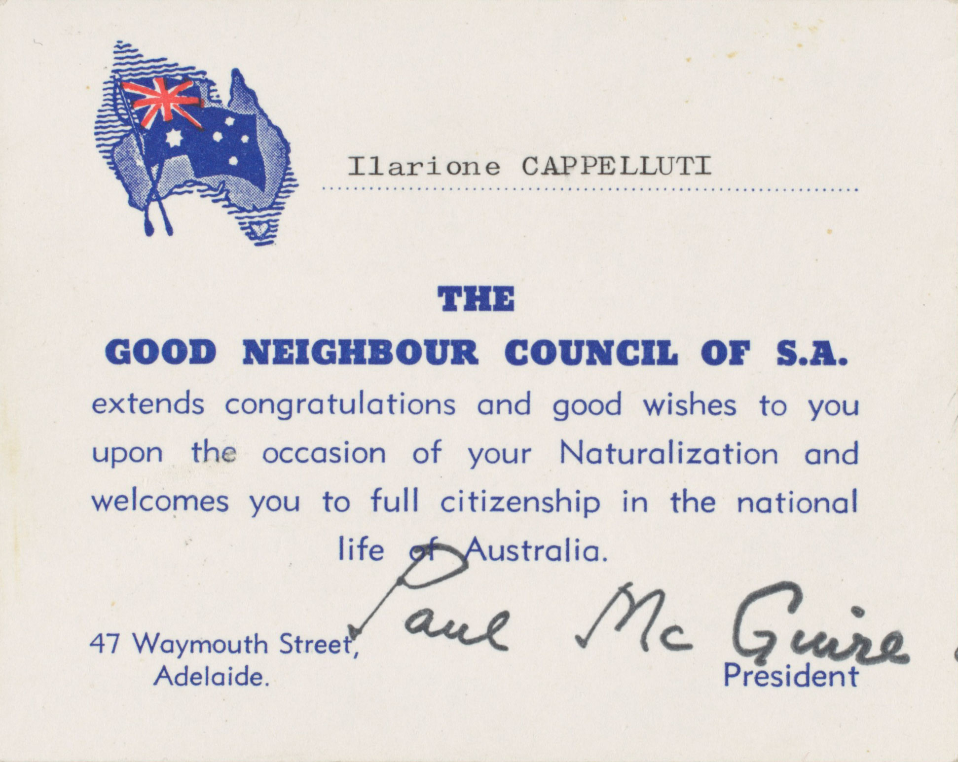Card issued to Mr Capelluti after his naturalisation, from the Good Neighbour Council, in 1962. The card reads ‘Ilarione Cappeluti. The Good Neighbour Council of S.A. extends congratulations and good wishes to you upon the occasion of your Naturalization and welcomes you to full citizenship in the national life of Australia’. The card is signed by Paul McGuire, President. The card has a poem titled ‘Song of Australia’ on the reverse.