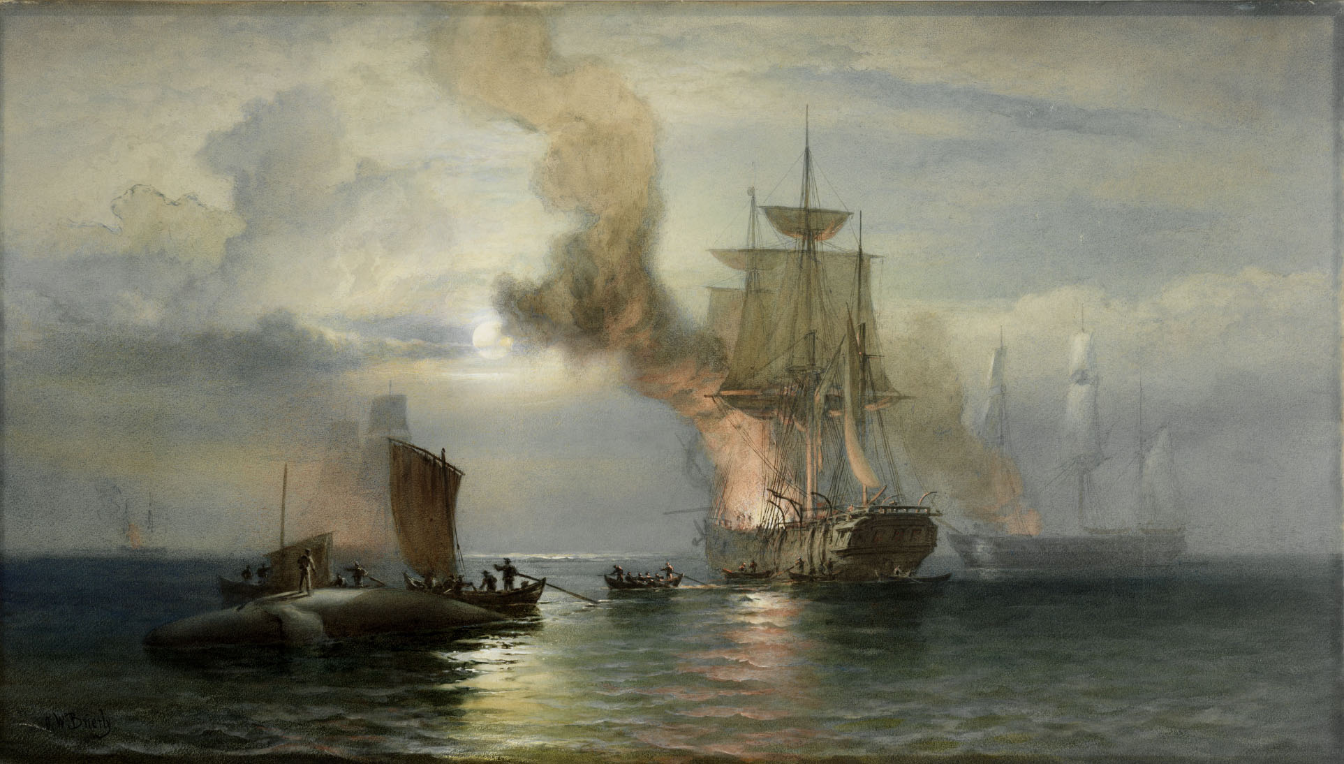 South Sea Whalers boiling blubber / Boats preparing to get a Whale alongside, by Oswald W. Brierly, 1876
