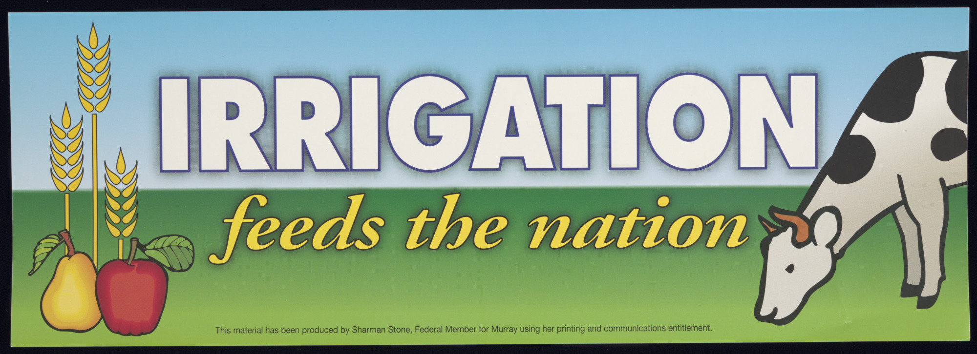 A rectangular coloured sticker featuring stylised images of a cow, fruit and grain and text which reads ‘IRRIGATION / feeds the nation’. Printed in black ink at the bottom are the words ‘This material has been produced by Sharman Stone, Federal Member for Murray using her printing and communications entitlements’.