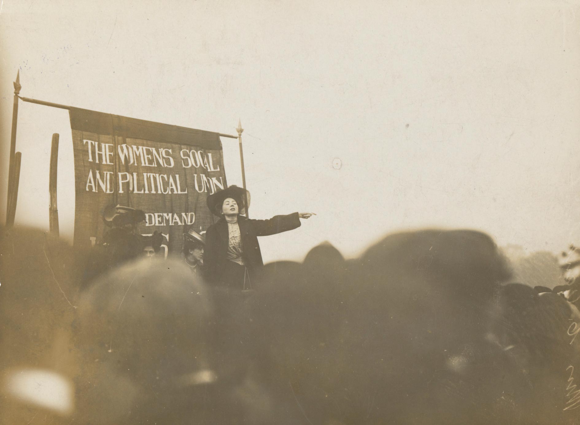 Women’s suffrage demonstration, with a Women’s Social and Political Union Banner in the background. From the National Library of Australia’s Bessie Rischbieth (1900-1967) collection.