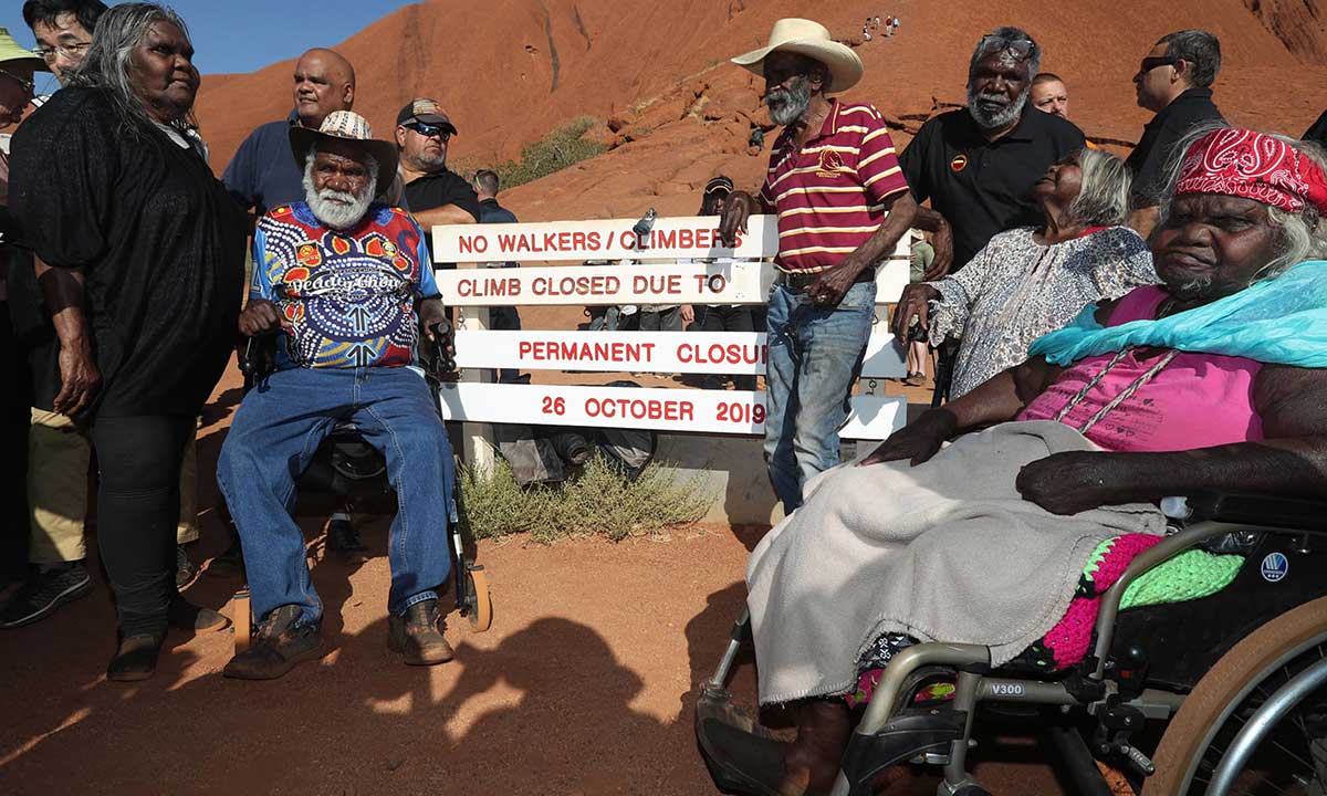 Traditional owners of Uluru gather around the base of the climb after it was permanently closed on 26 October 2019