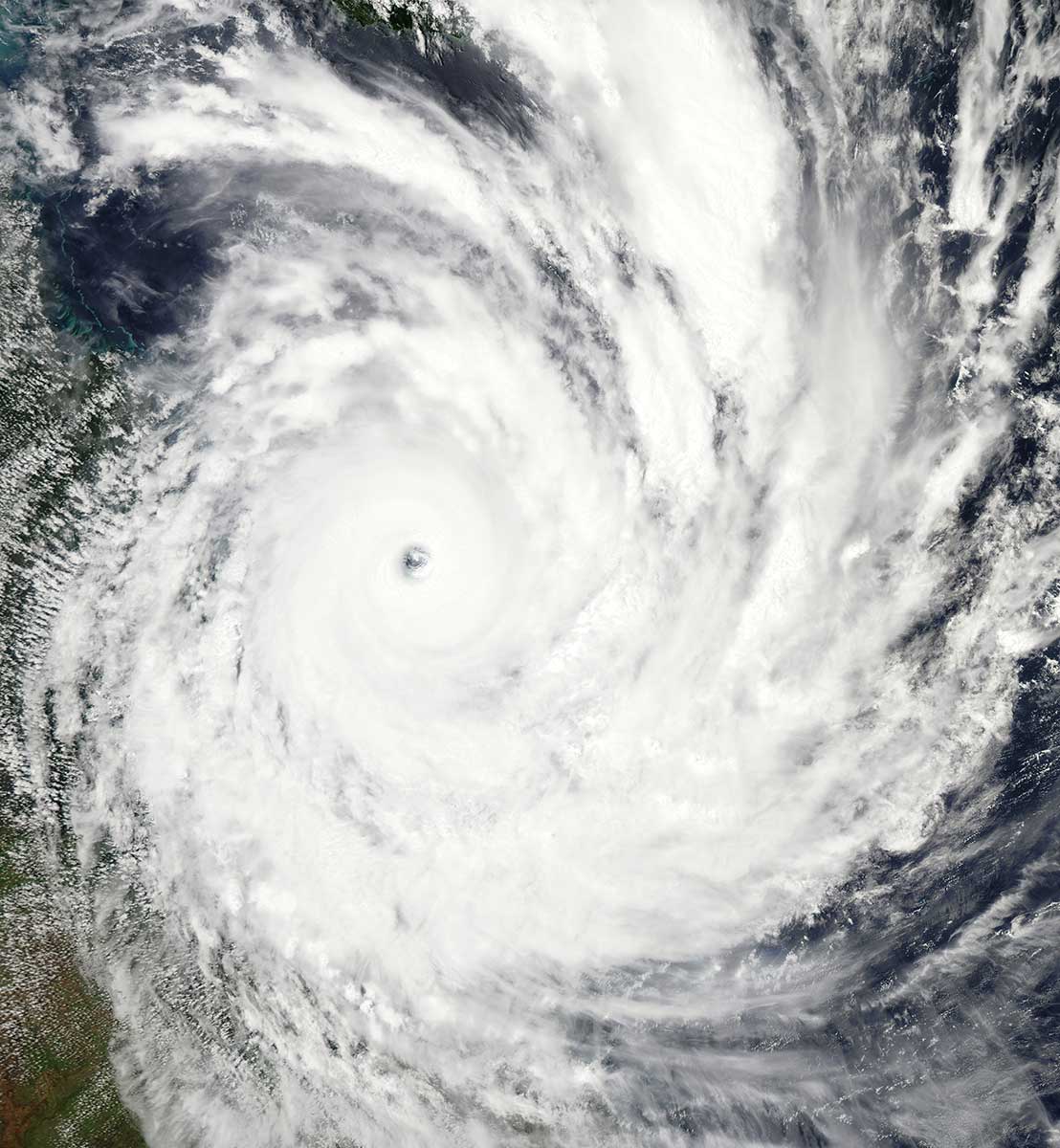 Cyclone Yasi, a category 5 cyclone, making landfall in Queensland, Australia. The eye of the cyclone is very clear and indicative of the power of this tropical cyclone.
