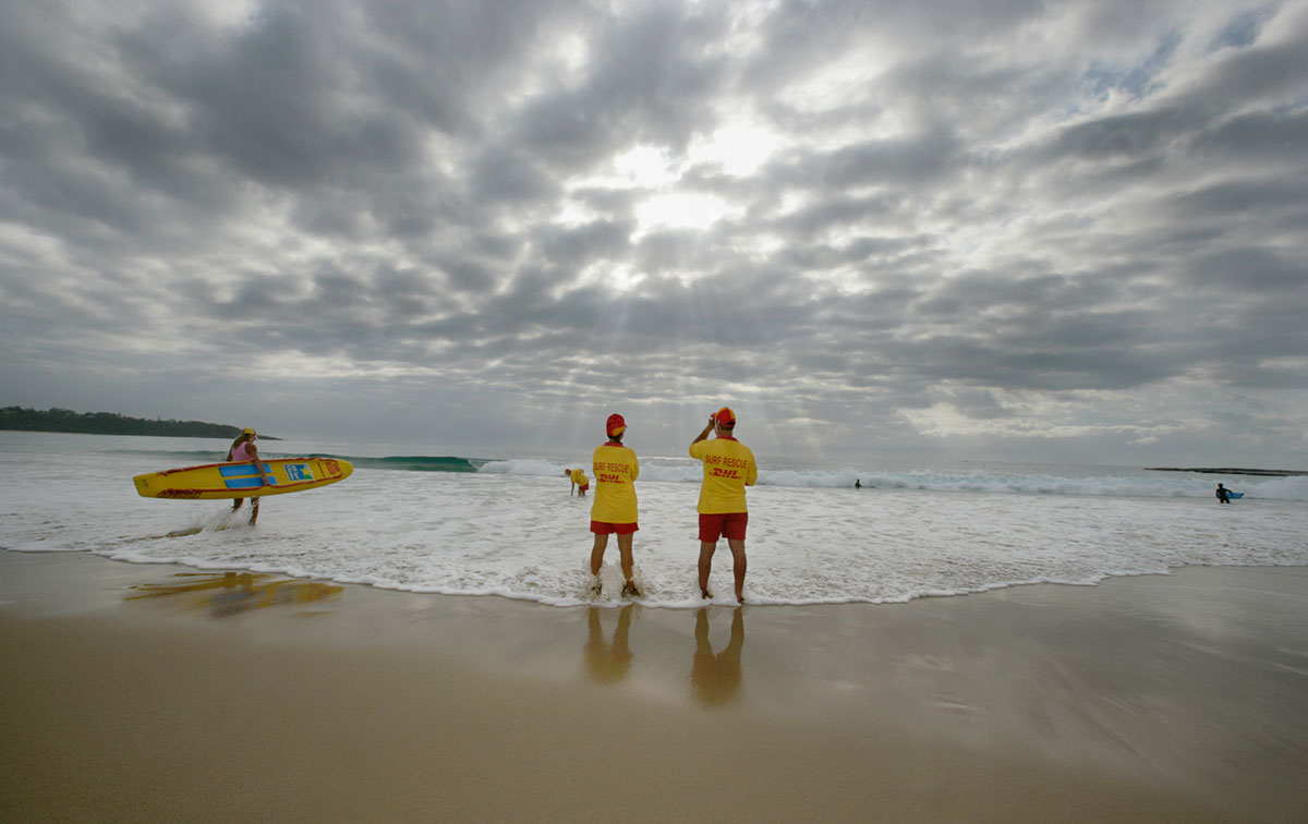 Two surf lifesavers stand looking out at the ocean at Mollymook, New South Wales