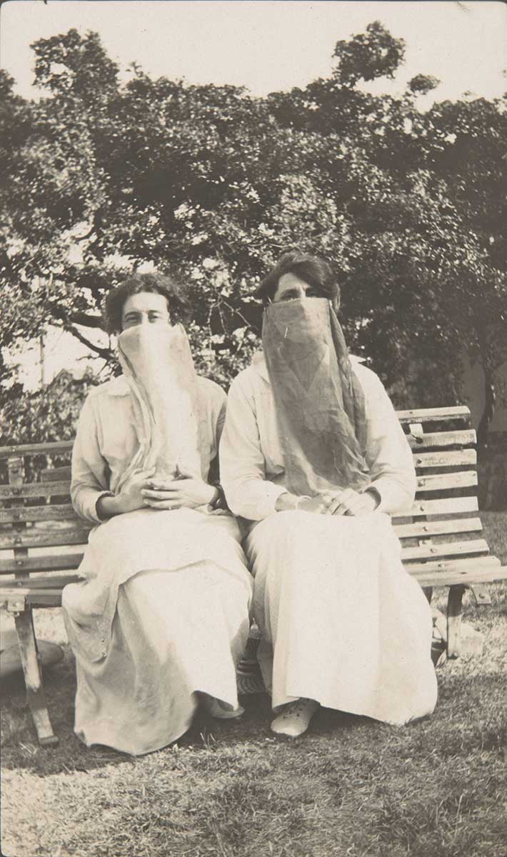 Two women wearing face scarves sitting on a park bench during the Spanish flu pandemic, 1918