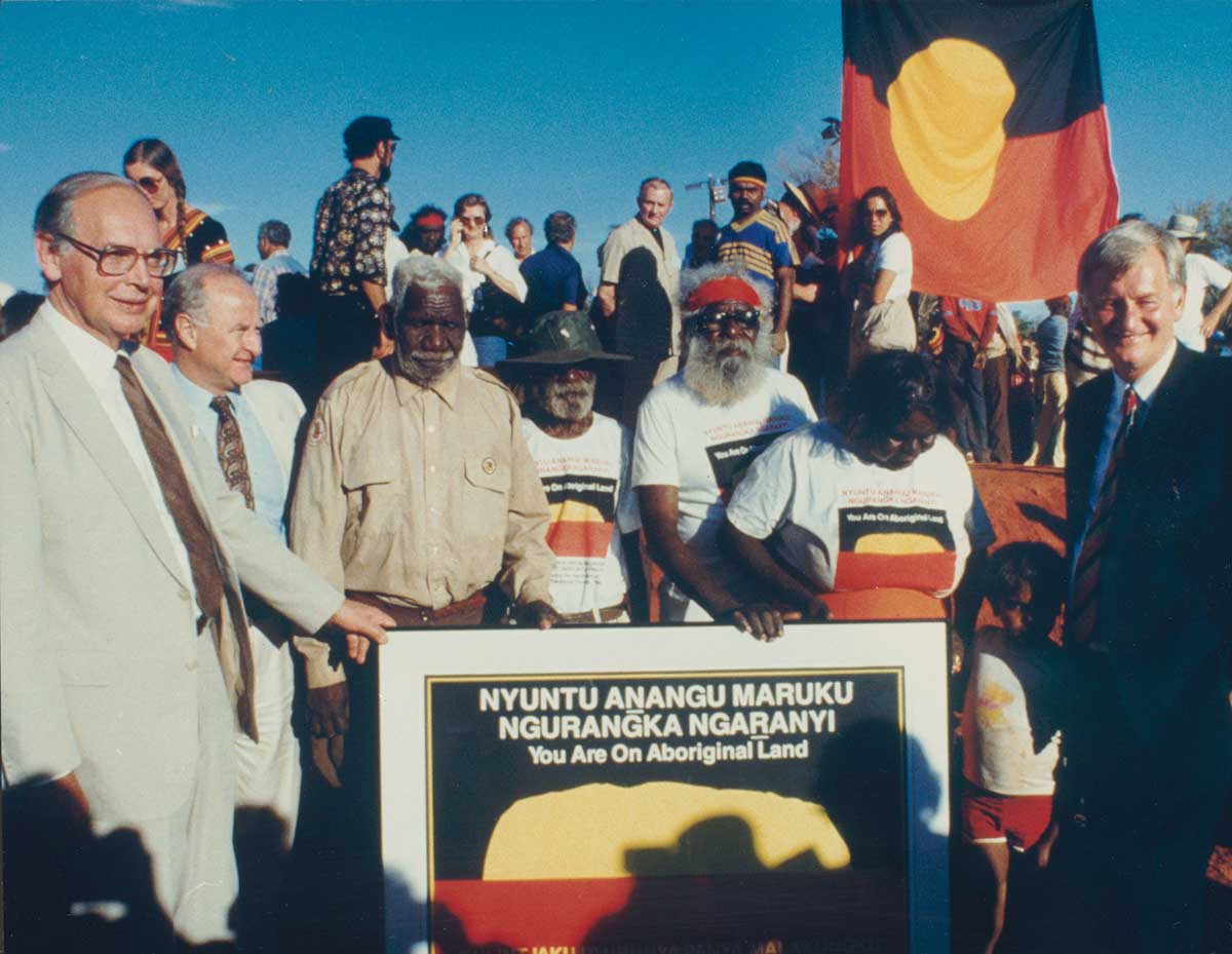 Traditional owners Mr Peter Bulla, Mr Peter Kanari, Mr Nipper Winmarti and his wife, Barbara Tjirkadu with Sir Ninian Stephen, Mr Holding and Mr Cohen (extreme right) and the special poster marking the handback of the title to Uluru-Kata Tjuta National Park.