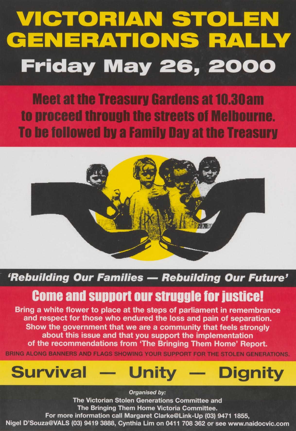 This poster advertises a rally, held in May of 2000, to bring attention to remember the difficulties faced by members of the Stolen Generations (Aboriginal and Torres Strait Islander children removed from their families by Australian governments). The poster advocates the implementation of the recommendations of the 1997 Bringing Them Home Report, which investigated Aboriginal child removal in Australia.