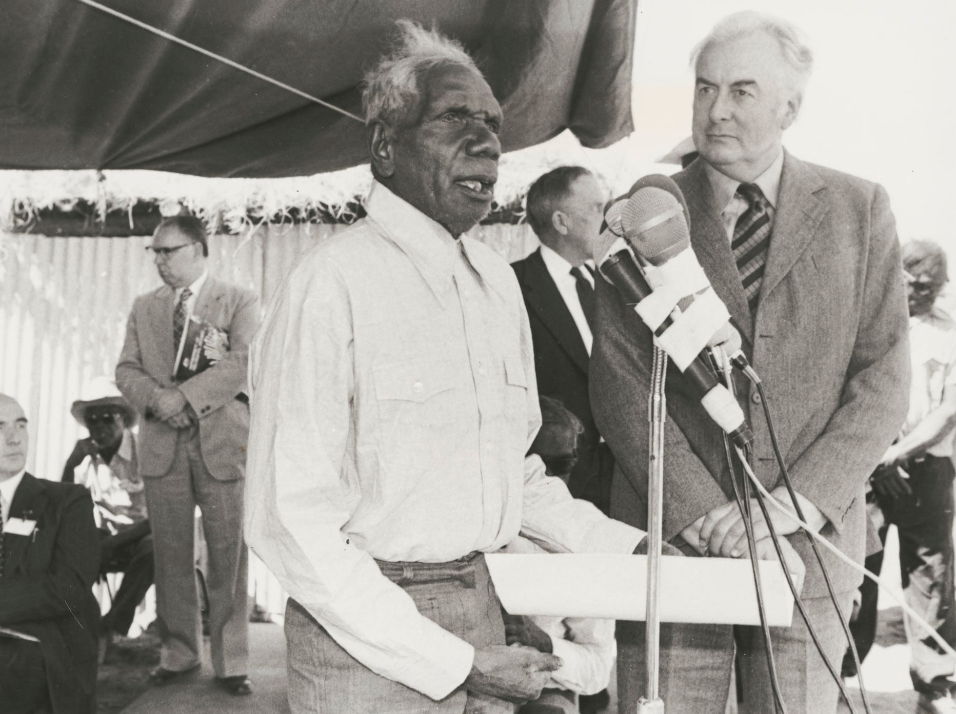 On 23 August 1966, 200 Gurindji stockmen, domestic workers and their families – led by Vincent Lingiari – initiated strike action at Wave Hill station in the Northern Territory. Negotiations with the station owners, the international food company Vestey Brothers, broke down, leading to a seven-year dispute. In August 1975, Prime Minister Whitlam came to Daguragu and ceremonially returned a small portion of Gurindji land to the traditional owners by pouring a handful of soil into Vincent Lingiari’s hand with the words, ‘Vincent Lingiari, I solemnly hand to you these deeds as proof, in Australian law, that these lands belong to the Gurindji people’. This is a photograph taken during that ceremony.