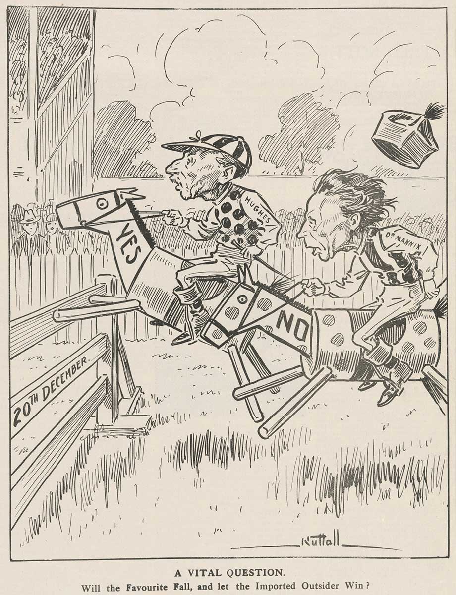 Cartoon drawn during the Australian conscription debates (1916-1917) showing Prime Minister Billy Hughes (who supported conscription) and Archbishop Daniel Mannix (who campaigned against conscription).