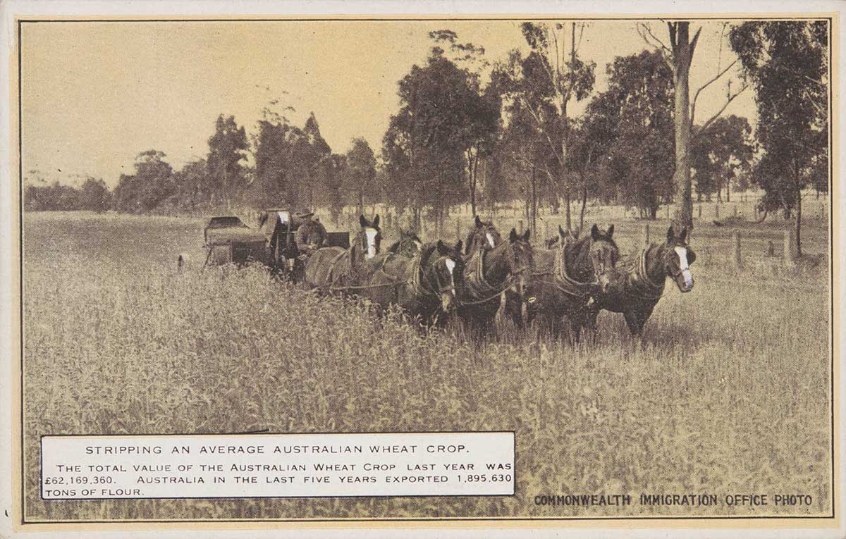 A Commonwealth Immigration Office postcard featuring an eight horse drawn wheat stripper and one man. The reverse of the card features the text ‘Kinsmen, we welcome you’ inside an outline of Australia.
