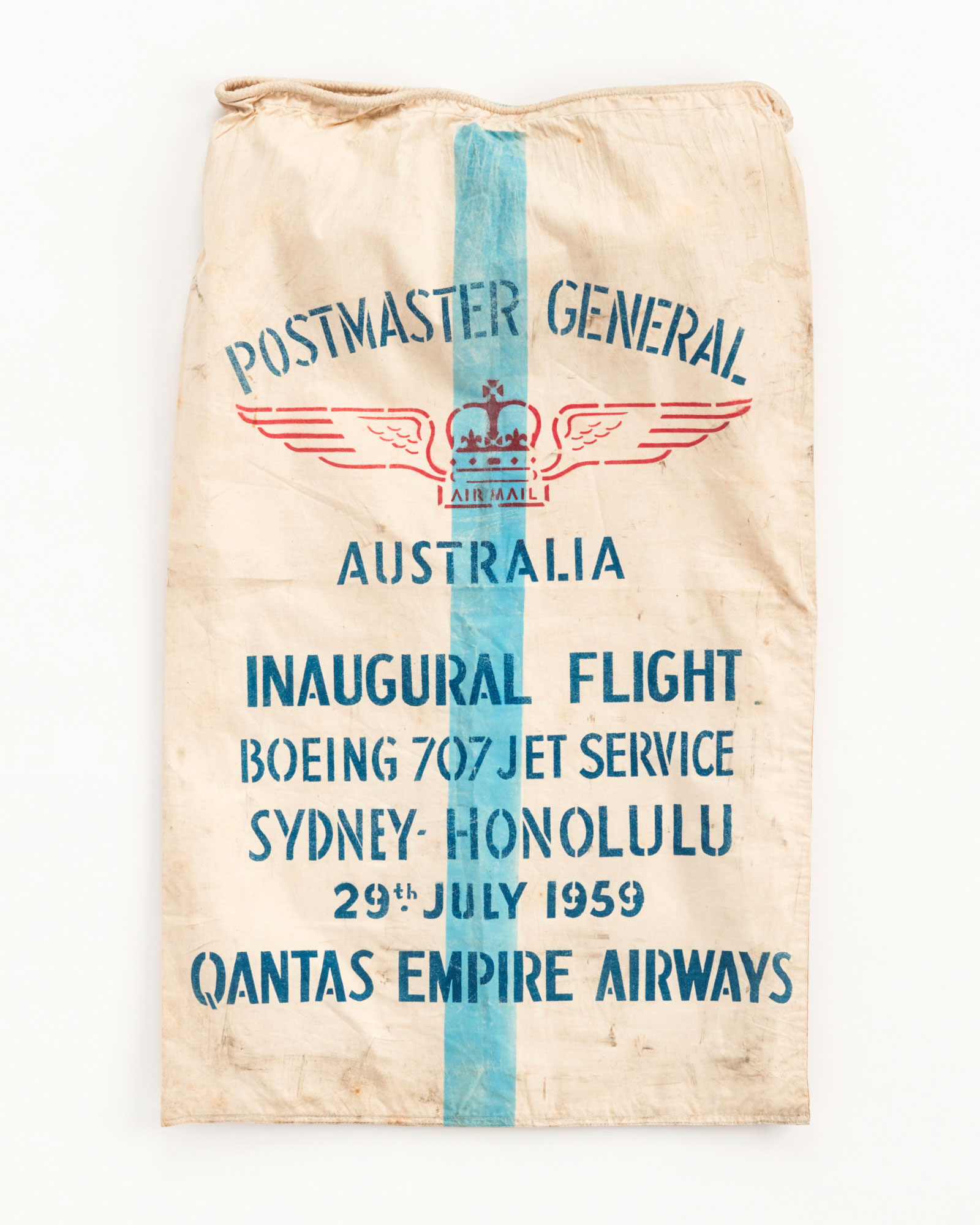 White canvas post bag celebrating the first Qantas flight between Sydney and Honolulu, 1959